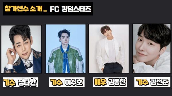 남자팀 FC 킹덤스타즈는 ‘정통트롯 황태자’로 불리는 정다한이 주장을 맡아 팀을 이끌며, 재강,양승호, 정해준, 이수호, 김선준, 금강, 김동찬, 성용하, 강설민, 김영기, 권용태, 이윤신,황인성 등 개성 넘치는 멤버들이 함께한다. 풋살 경기를 통해 그들의 새로운 면모를 팬들에게 선보일 예정이다.