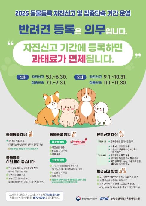 이연숙 농식품부 동물복지정책과장은 “동물 등록은 반려견을 가족의 일원으로 받아들이고, 책임지는 첫걸음”이라며, “올해는 특히 동물등록제를 보다 널리 알리고 참여를 독려하기 위해 신고기간을 2회로 확대한 만큼, 반려인들이 적극 협조해 줄 것”을 당부했다.