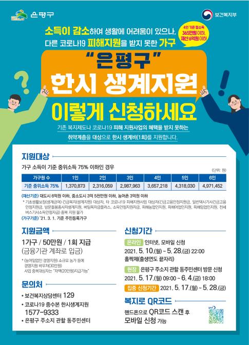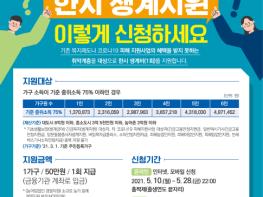 한시 생계지원 사업은 2019~2020년도 대비 올해 1~5월의 소득이 감소하고, 기준 중위소득 75%(4인 가구 기준, 월소득 365만원) 이하이며, 재산이 6억원 이하인 가구가 대상이다.