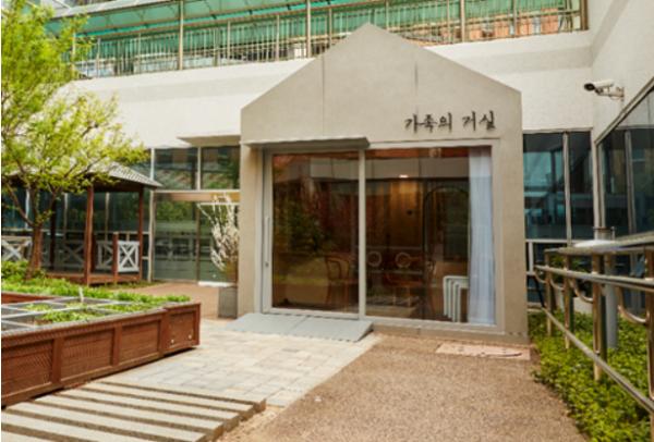 ‘가족의 거실’에는 그림책 '여든, 꽃'의 저자 김선순 어르신의 작품들이 전시되어 있다. 김선순 어르신은 여든이 거의 다 되어서 책마을학교를 다니며 늦은 나이에 그림의 재능을 발견, 그림책 작가가 되었다. ‘누구나 살면서 꽃을 피우지’라는 작가의 말처럼 어르신들의 희망의 꽃이 행복한 만남으로 피었으면 하는 바람을 담았다. 향후 면회공간 벽면을 활용해 갤러리처럼 어르신들의 작품을 전시 가능하다.