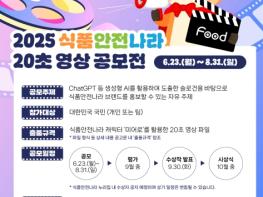 식품의약품안전처 식품안전정보원은 6월 23일부터 8월 31일까지 ‘2025 식품안전나라 20초 영상 공모전’을 개최한다고 밝혔다. 이번 공모전은 식품안전나라에서 제공하고 있는 다양한 식품안전정보를 국민