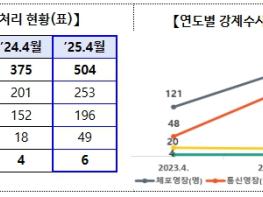 고용노동부에 따르면 ’25년 4월 기준으로 구속수사, 체포영장 집행 등 강제수사 실적이 504건으로 지난해 같은 시기에 비해 크게 증가(34.4%)한 것으로 확인됐다. 이는 ’23년 4월(193건)과 비교하면 무려