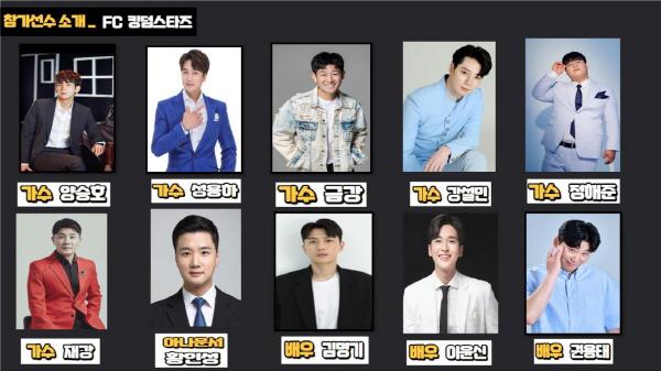 남자팀 FC 킹덤스타즈는 ‘정통트롯 황태자’로 불리는 정다한이 주장을 맡아 팀을 이끌며, 재강,양승호, 정해준, 이수호, 김선준, 금강, 김동찬, 성용하, 강설민, 김영기, 권용태, 이윤신,황인성 등 개성 넘치는 멤버들이 함께한다. 풋살 경기를 통해 그들의 새로운 면모를 팬들에게 선보일 예정이다.