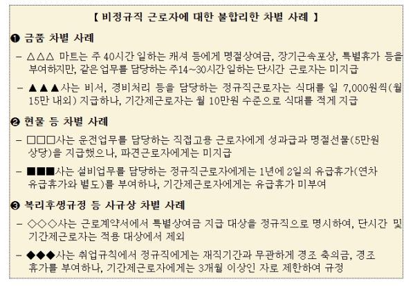 구체적으로 정규직과 동종?유사 업무에 종사하는 기간제?단시간?파견 근로자 등에게 합리적 이유 없이 ①식대?명절상여금 등을 지급하지 않은 금품 차별(18개소, 71백만 원), ②명절선물 등을 지급하지 않는 현물 차별(3개소) 등 적발된 사항에 대해 곧바로 시정 명령하여 전부 개선토록 했다.