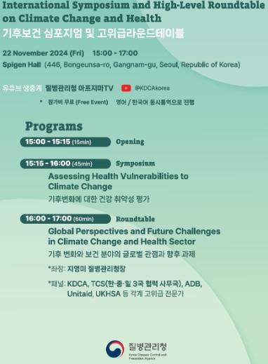아울러, 고위급 라운드테이블에서는 글로벌 공중보건 리더 및 각계 전문가들이 참석하여 ‘기후변화와 보건 분야의 글로벌 관점과 향후 과제’에 대하여 지역, 권역, 국가 및 글로벌 차원에서의 다각적인 토론이 이루어진다.
