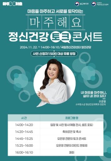 [맘스타임즈, 최영진기자] 보건복지부 국립정신건강센터(센터장 곽영숙)는 11월 22일 국립정신건강센터에서‘마주해요’정신건강 토크콘서트를 개최했다고 밝혔다.