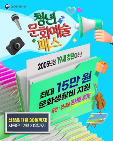 그래서? 정부가 ‘청년문화예술패스’로 성년이 된 전국의 19세(2005년생) 청년들에게 1인당 10만 원에서 15만 원까지 공연·전시 관람비를 지원합니다.?사회에 첫발을 내딛는 청년들이 비용 부담 없이 다양한 문화콘텐츠를 즐길 수 있도록 올해 처음 시행됐답니다.?11월 21일부터는 뮤지컬, 연극 같은 공연과 전시 외에 대중음악 콘서트, 음악 페스티벌 등도 관람할 수 있게 됐어요.