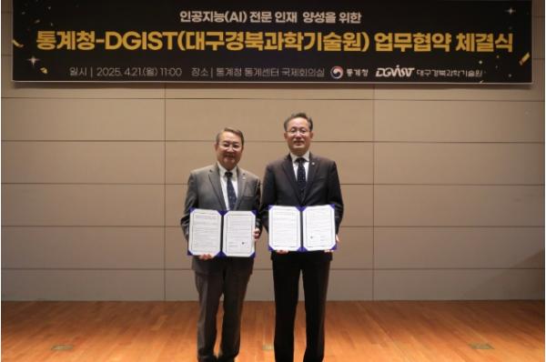 [맘스타임즈, 최영진기자] 통계청과 DGIST(대구경북과학기술원, 총장 이건우)는 4월 21일, 통계청 통계센터 국제회의실에서 “인공지능(AI) 전문 인재 양성”을 위한 업무협약을 체결했다.