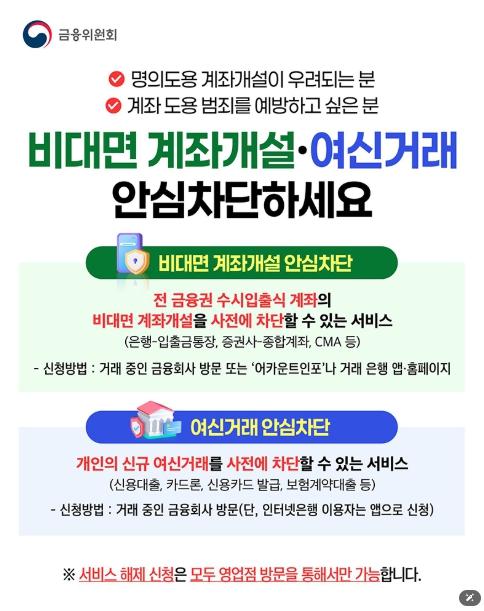 전 금융권 수시입출식 계좌의 비대면 계좌개설을 사전에 차단할 수 있는 서비스.