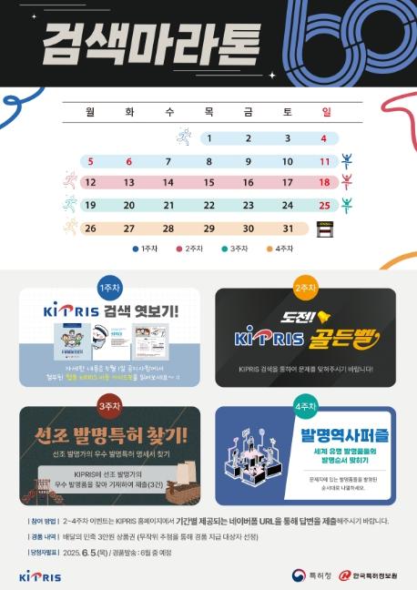 한편, 모든 주차별 행사에 참여한 완주자에게는 ‘검색 마라톤 완주 인증서’와 함께 추첨을 통한 상품을 제공할 예정이며, 자세한 사항은 키프리스 누리집에서 확인할 수 있다.