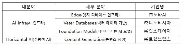 ‘인공지능(AI) 100’에 선정된 국내 인공지능(AI) 창업기업(스타트업)의 지원 내역과 주요 기술을 살펴보면 다음과 같다.