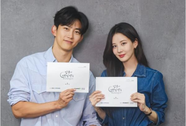 이날 대본리딩 현장에는 경로 이탈 로맨스를 그려낼 서현(차선책 역), 옥택연(이번 역), 권한솔(조은애 역), 서범준(정수겸 역), 지혜원(도화선 역)을 비롯한 배우진과 이웅희, 강수연 감독, 그리고 전선영 작가가 모여 호흡을 맞췄다.