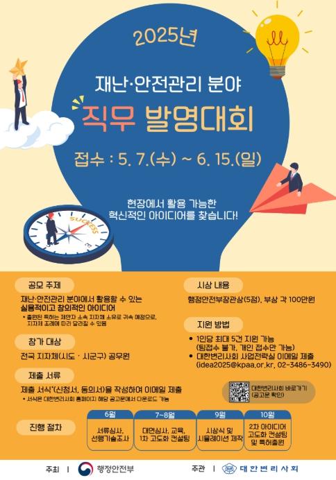 [맘스타임즈, 최영진기자] 행정안전부는 지자체 공무원을 대상으로 5월 7일부터 6월 15일까지 ‘2025년 재난·안전관리 분야 직무 발명대회’를 개최한다.