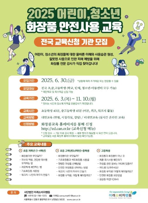 식약처는 2015년도부터 어린이·청소년이 올바르고 안전하게 화장품을 사용할 수 있도록 주로 학교를 대상으로 교육을 진행해왔으며, 올해는 6월 3일부터 11월 10일까지 2만 명을 대상으로 300회 이상 교육을 실시할 예정이다.