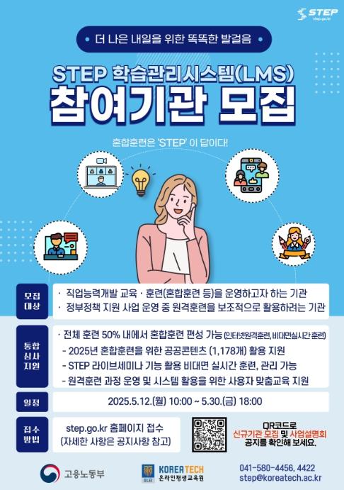 2025년 상반기 스텝 학습관리시스템 활용에 참여하고 싶은 기관·기업은 자세한 내용을 스텝 누리집에서 확인할 수 있으며, 30일 18시까지 신청할 수 있다.