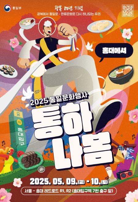 [맘스타임즈, 최영진기자] 통일부는 5월 9일부터 10일까지 서울 홍대 레드로드 광장에서 “광복 80년 기념, 한류문화로 다시 하나되는 우리 - 광복에서 통일로”라는 주제로 2025년 통일문화행사 「홍대에서 통하나봄」을 개최한다.