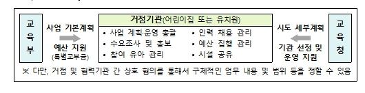 거점형 돌봄기관으로 지정된 기관은 인근의 어린이집 또는 유치원과 사전 협의를 통하여 학부모의 수요를 반영한 돌봄 서비스를 제공하게 된다. 아침·저녁 출퇴근 시간대를 지원하는 ‘맞춤형 돌봄’ 및 ‘토요(휴일) 돌봄’ 등 돌봄 수요가 높은 서비스를 제공하며, 3~5세 특성화프로그램을 적극 활용하여 교육‧보육의 질도 제고한다.