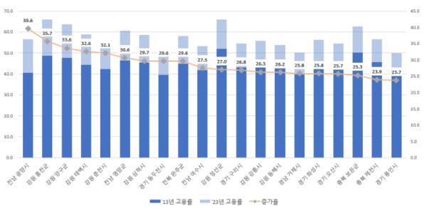 연구에 따르면 청년 취업자의 수도권-대도시 집중 추세가 더욱 뚜렷해진 반면, 인구소멸위험 지역의 청년층 취업자 감소가 두드러졌다. 조선업 밀집 지역을 포함한 영호남의 산업도시들도 청년고용률이 큰 폭으로 감소했다. 산업 도시들의 쇠퇴로 인해 기존에는 남성 중심의 고용구조를 갖고 있던 광양, 거제, 여수, 영암 등의 여성 고용률이 크게 증가한 점도 주목할 만한 변화다. 그 결과 수도권과 비수도권 간 상대임금 격차도 확대되어, 2013년에는 임금이 높은 상위 지역에 비수도권 산업도시들이 8곳이나 포함됐으나 2023년에는 6곳으로 감소했으며, 그나마 상위 10곳 이내에 세종시를 제외하고는 한 곳도 포함되지 않았다.