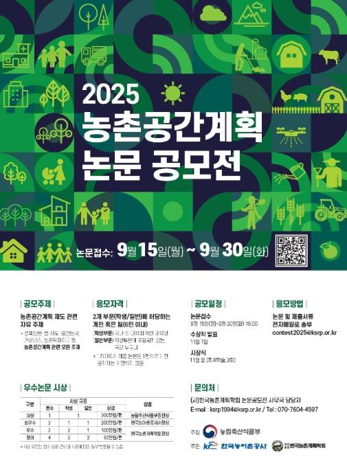 논문은 9월 15일부터 9월 30일 18시까지 (사)한국농촌계획학회 공모전 이메일을 통해 접수하며, 심사 및 공개검증 절차를 거쳐 11월에 총 10편의 수상작을 선정·발표한다.