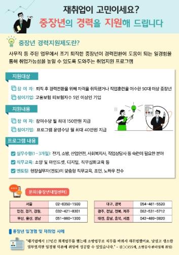 신중년특화과정을 수료한 중장년층의 재취업을 돕기 위해 ‘중장년 경력지원사업’과의 연계도 강화한다. 중장년 경력지원사업은 경력 전환을 희망하는 중장년에게 해당 분야의 현장 실무 경험 기회를 제공하는 사업으로 이번 추가경정예산을 통해 지원 규모를 당초 900명에서 2,000명까지 확대했다. 두 사업 간 연계를 통해 중장년들이 “직업훈련 → 일경험 → 취업”으로 이어지는 종합적인 지원을 받을 수 있을 것으로 기대된다.