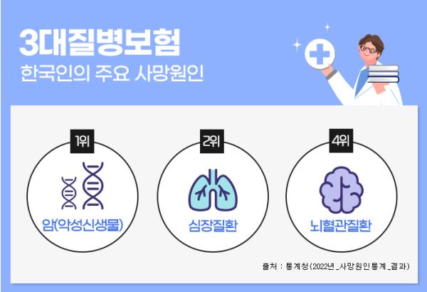 [맘스타임즈, 최영진기자] 3대질병으로 일컬어지는 암, 뇌혈관질환, 심혈관질환은 한국인의 주요 사망원인에서 상위를 차지하고 있으며, 이에 대한 진단비를 집중적으로 보장해 주는 보험상품을 3대질병진단비 보험이라 할 수 있다.