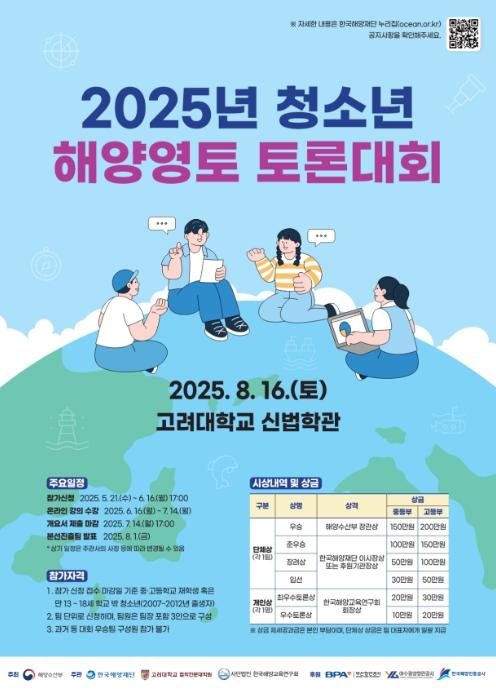 [맘스타임즈, 최영진기자] 해양수산부는 ‘2025년 청소년 해양영토 토론대회’ 및 ‘국제해양법 모의재판대회’ 참가자를 5월 21일부터 모집한다.