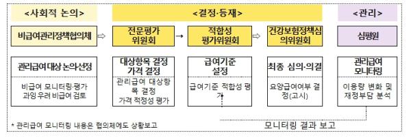 ‘비급여 관리 정책협의체’에서 선정한 항목은 요양급여 관련 위원회의 평가 후 건정심을 통해 관리급여 대상 항목 및 가격, 급여기준을 최종 결정한다.
