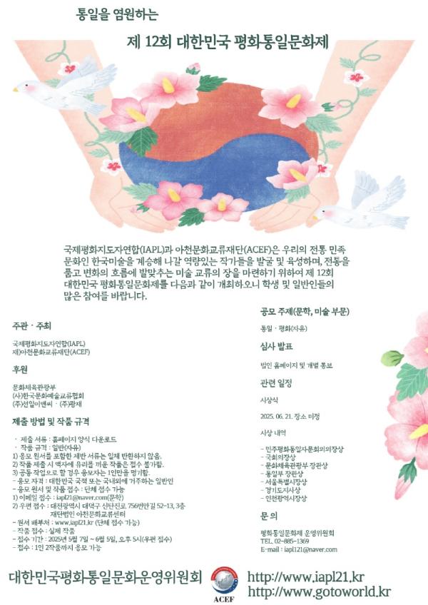 국제평화지도자연합(IAPL)과 재)아천문화교류재단(ACEF)이 공동 주최하는 행사로 대한민국 평화통일문화제는 문학 및 미술 대회가 공모전으로 열리며, 시상식에서는 특별공연이 펼쳐지며, 유치부, 학생부 및 일반 누구나 참여할 수 있으며, 5월 7일부터 6월 5 까지 접수하여 6월 21일에 시상하는 통일을 염원하는 제12회 대한민국 평화통일문화제를 개최한다고 밝혔다.