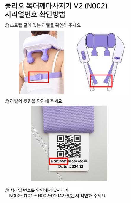 리콜 대상은 2024년 12월부터 2025년 1월 사이에 제조된 제품(이후 제품은 하부 마사지볼 재질 및 형상이 변경되어 리콜 대상에서 제외)으로, 마사지기 연결 끈에 부착된 표시 사항의 제품 시리얼 번호를 통해 확인 할 수 있다.