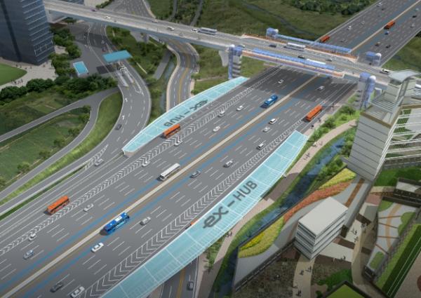 판교 ex-HUB는 경부 고속도로 본선에 광역버스 정류장과 환승공간·지원시설(정류장 간 엘리베이터 등), 판교 제2테크노밸리로의 연결도보 등을 설치하는 사업으로, ’27년 준공을 목표로 추진한다.
