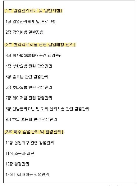 매뉴얼에는 감염예방에 대한 일반적인 원칙 뿐 아니라, 주요 한의 의료시술의 개요, 시술 시 감염 위험요인 및 감염예방 수칙을 별도의 장으로 분류하여 한의의료기관의 특수성을 반영했으며, 다양한 직종의 한의의료기관 종사자가 쉽게 이해할 수 있도록 감염관리와 관련된 용어의 정의를 함께 제시하여 현장에서의 활용성을 높이고자 했다.