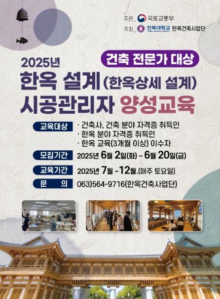 교육기관으로 지정된 전북대(한옥 설계 및 한옥 시공관리자)와 명지대(한옥 설계)는 7월부터 매주 토요일(현업 종사자를 위해 주말 수업)에 교육과정을 운영한다.