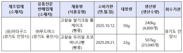 [맘스타임즈, 최영진기자] 식품의약품안전처는 식품제조·가공업체인 ‘(유)마더구스(경기도 안양시 소재)’가 제조하고 ‘(주)푸드머스(경기도 용인시 소재)’가 유통·판매한 ‘고칼슘 딸기크림 롤케이크’와 ‘고칼슘 우리밀 초코바나나빵’에서 식중독균인 살모넬라균이 검출되어 해당 제품을 판매 중단하고 회수 조치한다고 밝혔다.