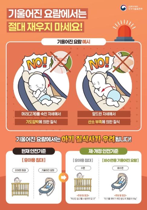 현재 ‘유아용 침대’의 일종으로 안전관리 중인 ‘기울어진 요람’에 대하여 별도의‘비수면용 기울어진 요람’안전기준을 제정하고, 아기의 질식 사고를 사전에 예방할 수 있도록‘유아용 침대’의 경우,‘푹신한 침구를 사용하지 말 것’을, ‘비수면용 기울어진 요람’에는 ‘수면용으로 제작된 것이 아님’을 명확히 표시하도록 안전기준 제·개정안을 마련하고 이해관계자의 의견수렴을 진행하고자 한다.