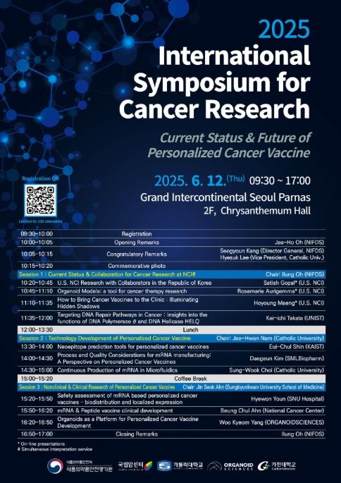 [맘스타임즈, 최영진기자] 식품의약품안전처 소속 식품의약품안전평가원은 ‘개인 맞춤형 치료용 암백신의 현재와 미래’를 주제로 ‘2025 국제 암연구 심포지엄(2025 International Symposium for Cancer Research)’을 6월 12일 그랜드 인터컨티넨탈 서울 파르나스에서 개최한다.