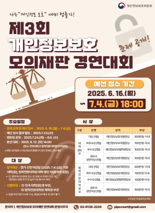 [맘스타임즈, 최영진기자] 개인정보보호위원회는 개인정보 관련 법률적·기술적 지식을 두루 갖춘 인재를 발굴하고 개인정보보호 현안에 대한 국민적 관심을 환기하기 위해, 오는 8월 12일 ‘제3회 개인정보보호 모의재판 경연대회’를 한양대학교에서 개최한다.