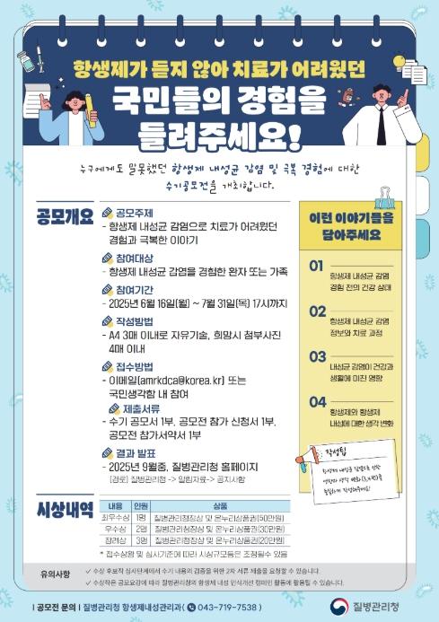 질병관리청(청장 지영미)은 항생제 내성에 대한 사회적 인식 제고를 위해 6월 16일부터 7월 31일까지 '항생제 내성균 감염 극복 수기 공모전'을 개최한다.