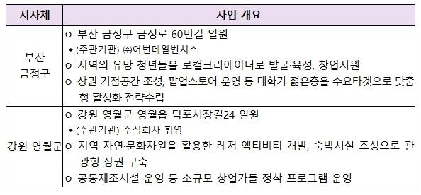 올해 4월부터 시작된 공모 접수에는 총 9개 기초지자체가 신청하여 경쟁률 4.5:1을 기록했고, 민간 전문가와 관계부처가 함께 참여하는 평가위원회를 통해 서면심사, 현장 및 발표평가를 진행하고 최종심의를 거쳐 부산 금정구, 강원 영월군을 최종 선정했다. 선정된 2곳은 상권 활력제고를 위해 1곳당 최대 20억원과 관계부처 사업들을 연계 지원받게 된다.