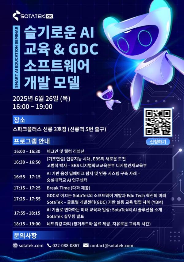 [맘스타임즈, 최영진기자] 글로벌 IT 솔루션 기업 SotaTek Korea는 오는 6월 26일, 선릉역 인근 스파크플러스 선릉 3호점에서 “슬기로운 AI 교육: GDC와 함께 여는 무한한 가능성”이라는 주제로 AI 교육 세미나를 개최합니다. 본 행사는 인공지능이 교육과 소프트웨어 개발 환경을 어떻게 재편하고 있는지 다양한 사례와 함께 조명할 예정입니다.