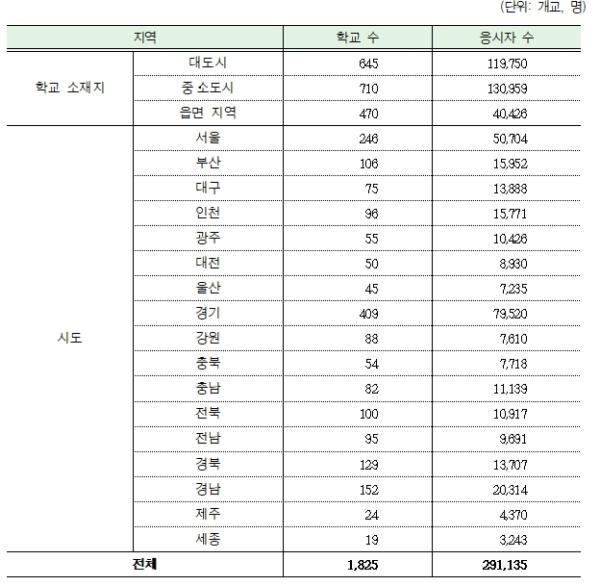 ○ 지역별 응시자 현황으로 학교 소재지, 시도별 학교 수와 재학생 응시자 수를 제시했다.